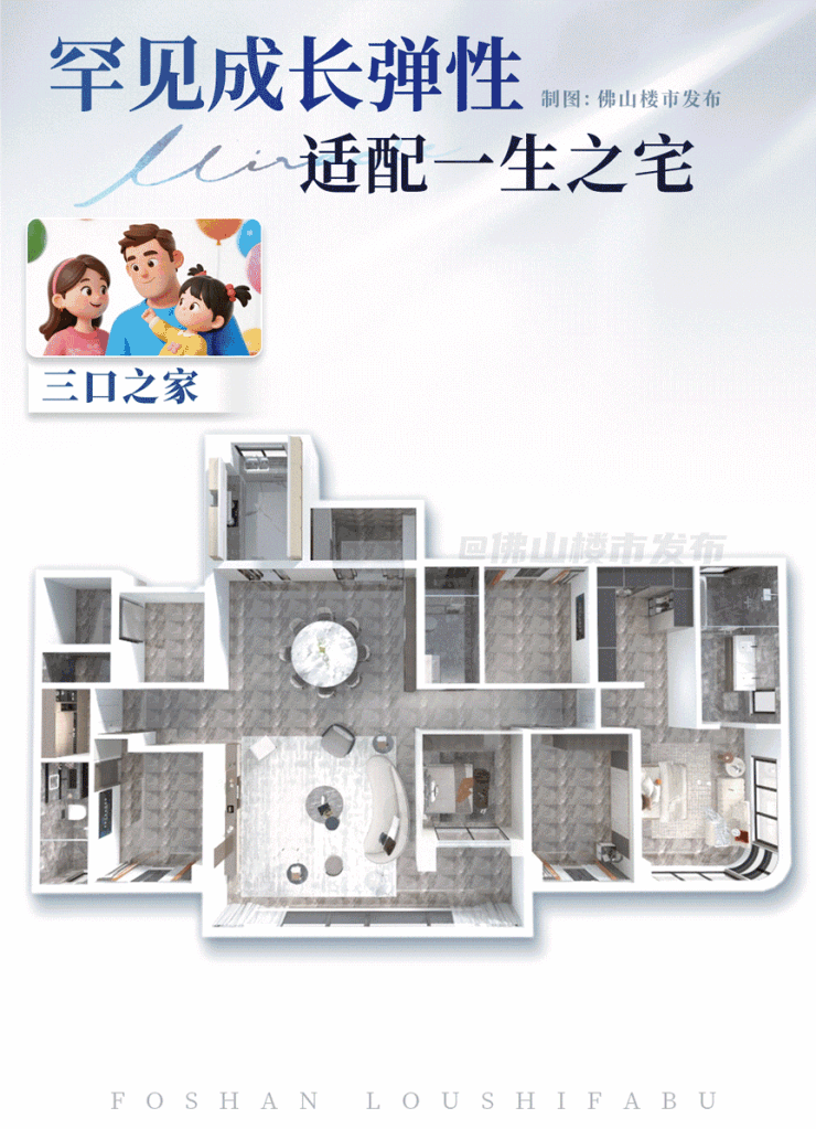 6. 全明通透,科技赋能:该户型为全明通透设计,每个房间都配备窗户,采光通风极佳;同时,户型全系标配华为5.0全屋智能系统和五恒空调系统,实现家居设备的智能联动与远程控制,达到恒温、恒湿、恒氧、恒洁、恒净的舒适标准,适配佛山不同季节的气候特点,提升居住的便捷度与舒适度[superscript:8][superscript:9]。