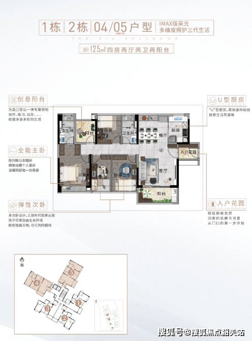 125㎡四室两厅两卫:多开间朝南,入户花园实现归家礼仪,个性化空间设计满足家庭成员的不同需求。创意阳台与全能主卧进一步增强了居住舒适度。