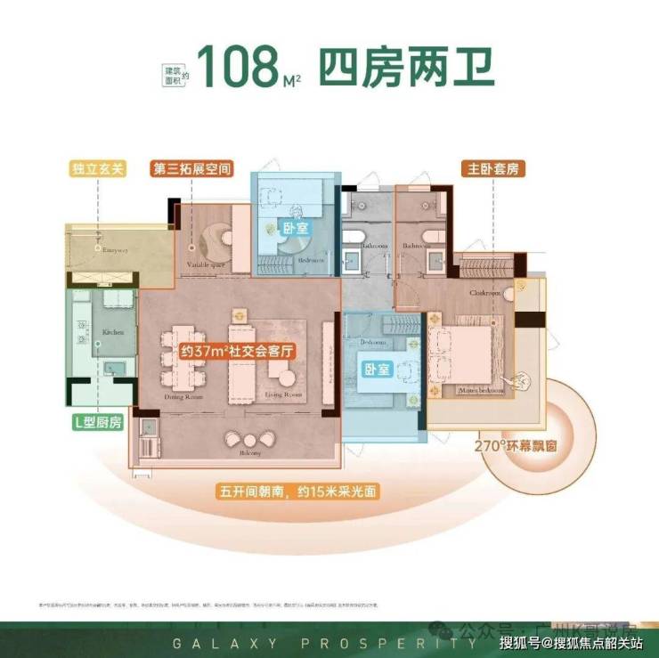 约108㎡四房两卫:主打改善型客户,超大开间、宽景阳台、LDK一体化设计,让客厅、餐厅、厨房融为一体,营造出豪宅般的社交空间。