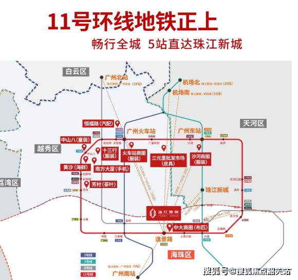 对于居住在珠江壹号的业主而言,出行便捷度达到了极致。负一层直接与地铁站联通,风雨无阻。仅需5站地铁,即可直达珠江新城核心区;同样5站,便可抵达琶洲会展中心。这意味着,无论是在珠江新城的写字楼里运筹帷幄,还是在琶洲参加国际盛会,亦或是前往越秀、荔湾享受老城韵味,都只在转瞬之间。此外,11号线还连接了广州十大专业市场,商贸物流畅通无阻。这种“5站直达双CBD”的交通效率,极大地拓展了业主的生活半径和工作半径,让“半小时生活圈”成为现实。