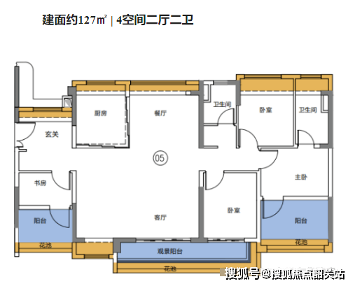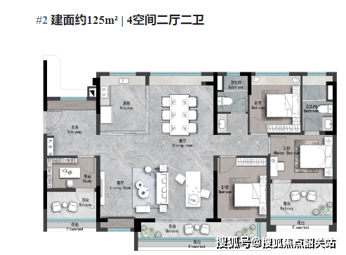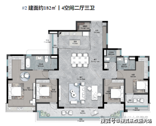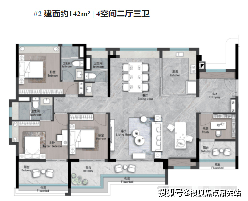 142㎡四房:四开间朝南+中西双厨+双套房设计,主卧270°转角飘窗直面华工景观;
