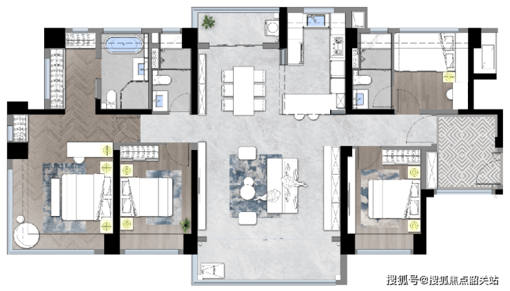 主力户型集中在118–198㎡,全部为四房起步,LDKB一体化是标配。我重点看了173㎡和198㎡两个样板间,共同点是公区尺度感很强。173㎡做了约5.9米的横厅,搭配双向阳台,一边看江、一边看园林;198㎡更夸张,近10米宽的瞰江阳台几乎横跨整个客厅,配上无柱转角飘窗,视野真的没遮挡。值得一提的是“花园式入户”——每户门口都留出一块半私密过渡空间,可以放鞋柜、绿植甚至小座椅,既保证仪式感,又解决玄关收纳痛点。厨房也下了功夫,烟道外挂后,操作台面多出近半米,还预留了零冷水管道,早上洗漱不用等热水。