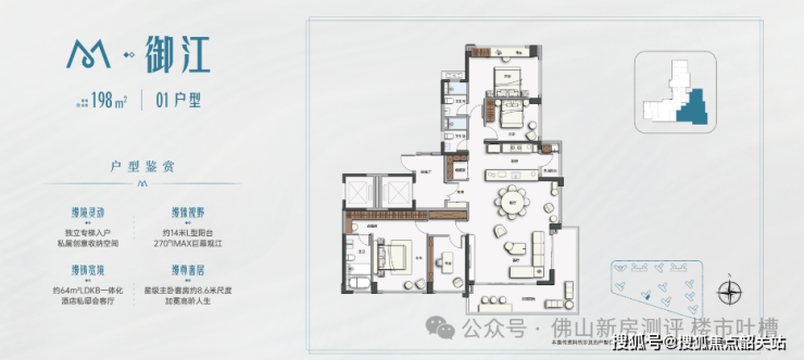 顶奢大平层户型,3 梯 3 户设计,专梯入户,私密性极强。户型格局方正,五开间朝南,客厅开间达 5 米以上,搭配 8 米以上超大阳台,270° 无边界江景视野,主卧尊享双台盆、独立浴缸、衣帽间的总统套房设计,次卧均为套房设计,满足高端改善家庭的极致居住需求。