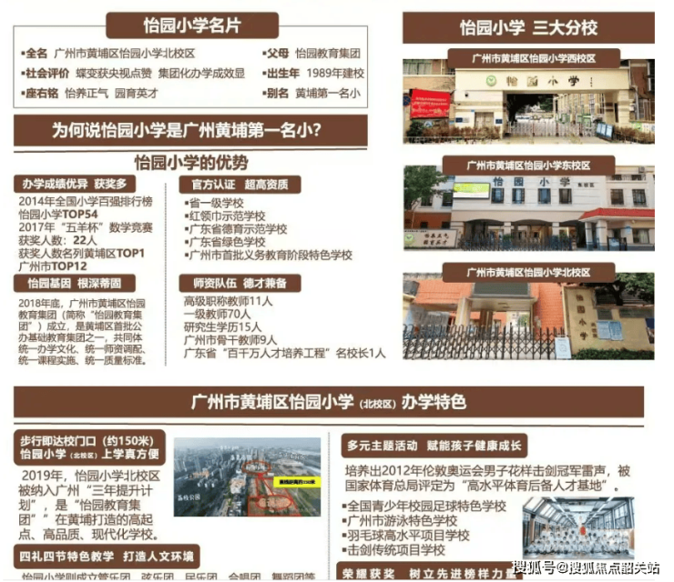 小学(核心):怡园小学(北校区),1989 年建校,广东省首批省一级学校,黄埔区老牌教育标杆。师资力量雄厚:现有教师 220 余人,其中特级教师 5 人、省级骨干教师 12 人、市级学科带头人 20 人,95% 以上本科及以上学历。教学成绩突出:连续三年考上市奥校人数全区第一,华罗庚杯等竞赛屡获大奖,小升初派位组为老黄埔最优组别,对口优质初中资源。北校区 2025 年底主体封顶,2026 年 9 月正式开学,硬件全新升级。