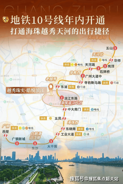 自驾方面,江湾大桥直连越秀区,可瞬达天河。目前地铁方面,虽距离 2 号线市二宫站约 1.2 公里,但待东侧 10 号线滨江东站建成后,将可实现 1 站东湖,2 站五羊邨,3 站广州大道中。