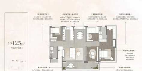125平方米四房两卫:LDBGK一体化设计,阳台连通次卧长达8.4米,总价约405-440万元。