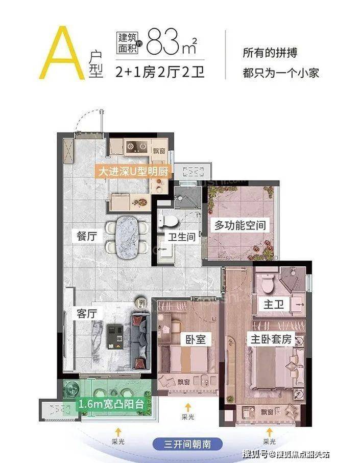 此户型南北通透,空气流通顺畅,室内时刻保持清新。双阳台布局,让生活与景观完美结合,一边可晾晒衣物,一边可欣赏风景。主卧套房配备独立卫浴,三代同堂居住也能互不干扰,为家庭生活提供了舒适与便利,适合追求品质生活的三口之家或三代同堂家庭。