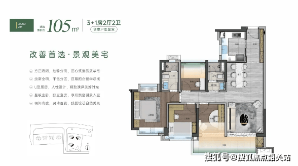 项目在售户型有 72-88-105㎡的四房户型,二期 5 号楼还有 110-129-143㎡的大户型。72㎡的户型能做到四房,空间利用率极高,满足了刚需家庭的居住需求。各个户型布局合理,功能分区明确,动静分离,保证了居住的舒适性和私密性。客厅宽敞明亮,连接观景阳台,采光和通风效果极佳。卧室设计温馨舒适,部分户型带有飘窗,增加了空间的延展性和趣味性。