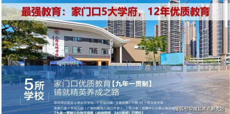 教育资源丰富:与广东仲元中学签约,落地九年制公立 72 班优质名校,且项目已建设 5 所学校,覆盖幼儿园、小学及初中等 3-15 岁学龄段,其中石楼镇中心小学山海连城学校、广钢利联花园幼儿园均已开学,公立广钢利凯花园幼儿园也即将开学,教育资源不断完善,可满足业主子女的教育需求.