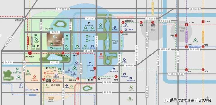 交通多维立体,道路交通上海五路年内全线贯通后,约 3KM 直达千灯湖核心区;地铁方面,双地铁环绕,距地铁 3 号线中山公园站约 700 米,3 站到桂城,8 站到广州荔湾;高铁交通上,2 公里处佛山火车站将升级高铁站,预计 2025 年通车,广湛高铁 10 分钟到广州越秀,1 小时畅玩大湾区。