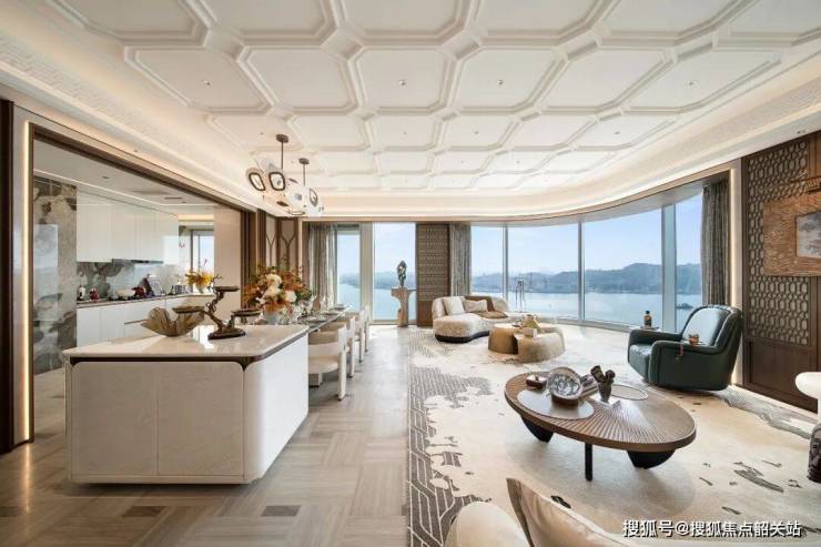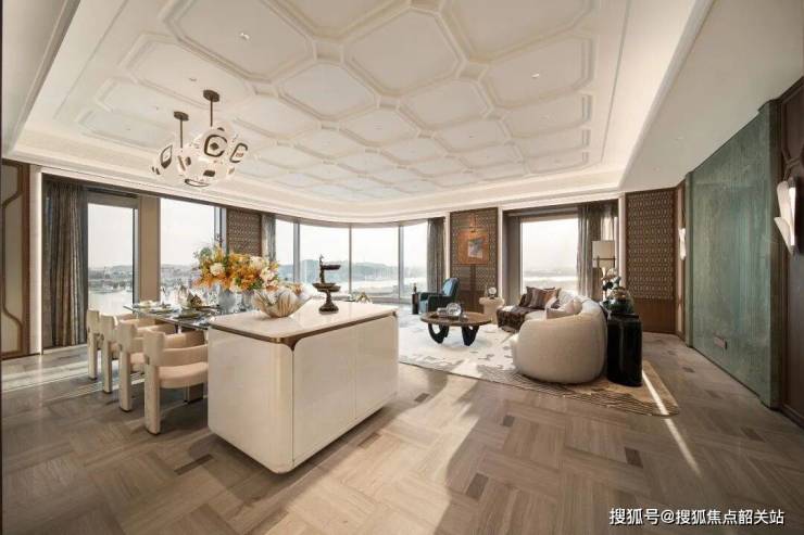 项目主力户型面积段覆盖200至400平方米,其中289平方米的“领头雁”大平层尤为引人注目,全盘仅规划26套。该户型在空间布局上打破了传统大平层的方正格局,整体造型模拟游艇形态,以适配半岛地形与江景朝向。客厅层高达到3.55米,高区户型层高更是提升至3.9米,这一数据在广州市场的大平层产品中具有显著优势。最为核心的是其270°环幕弧形落地窗设计,取代了传统的折角窗,实现了无死角的景观视野。全屋江景视线长度超过30米,不仅客厅与主卧面向江景,次卧、厨房乃至主卫生间均设置了观景窗。特别是主卧空间,采用东南朝向,可俯瞰三江汇聚的壮阔景象。在交标配置上,墙面与地面大面积使用奢石与拼花工艺,客厅背景墙选用Tiffany绿奢石,厨房推拉门镶嵌金箔,主卧地板采用方弧形木拼花。卫浴系统配备汉斯格雅洁具、杜拉维特马桶及韦宝浴缸,厨房则标配瑞族六件套、双开门冰箱及电动遥控窗,并内置净水系统。这种“全屋望江”且“高标交付”的产品逻辑,旨在最大化每一寸空间的景观价值与居住舒适度。
