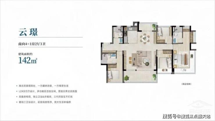 142平方米的户型则是为改善型家庭量身打造的。五房三卫带主套的设计,提供了极其宽敞的居住空间。四开间朝南的设计,让室内充满了阳光,采光通风效果堪称绝绝子。