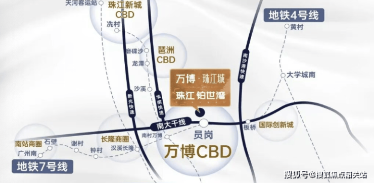 高效的通勤是都市精英生活的基石。珠江万博城在售的A2组团,距离已运营的广州地铁7号线员岗站仅约550米,属标准的“地铁上盖”物业,步行轻松可达。搭乘7号线,仅需1站即可到达南村万博站,在此可换乘地铁18号线(时速160公里的湾区快线),实现4站到琶洲、5站到珠江新城的极速通勤。地铁网络将广州核心就业区紧密串联。