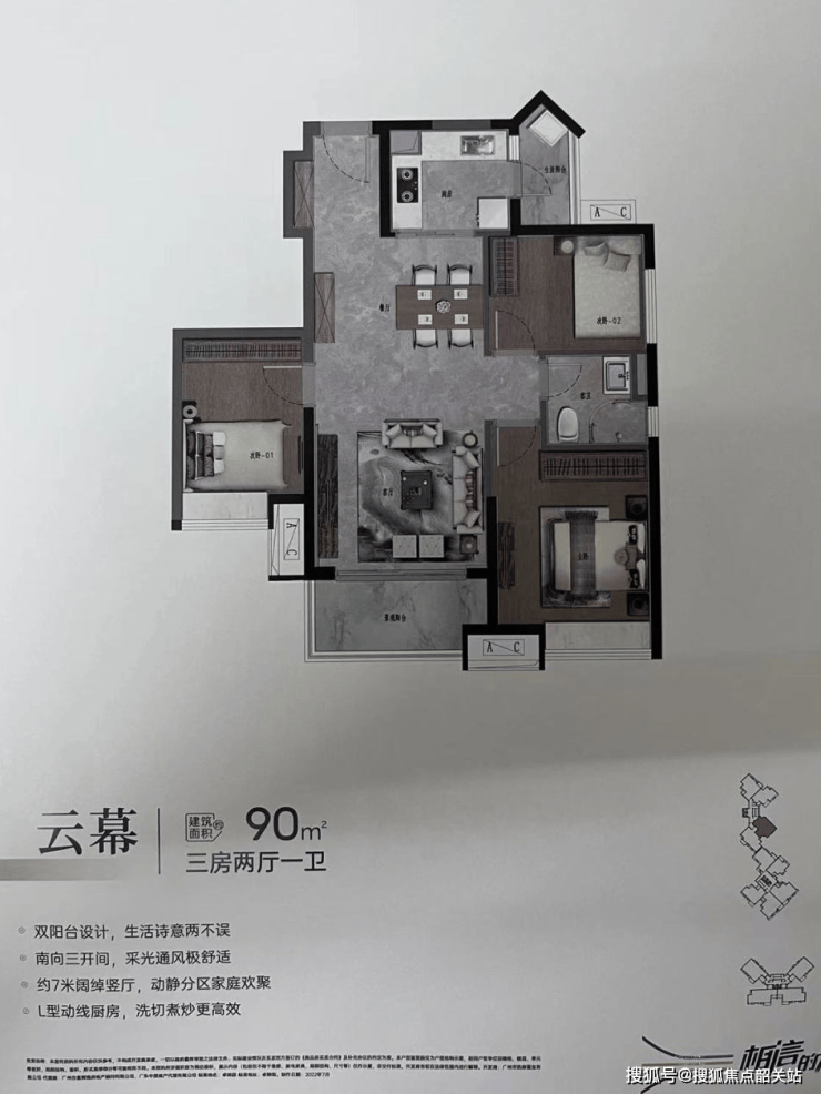 89㎡三房 ,三开间朝南,客厅宽敞双阳台设计,这个户型是整个项目中比较好的,预计会比较抢手。
