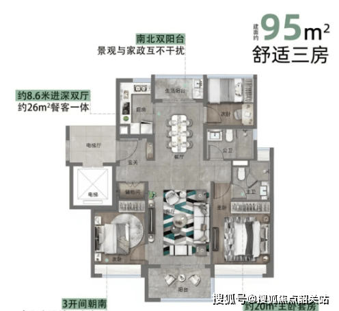 总价 388 万任选,首付最低 58.2 万起。核心亮点:南北对流设计,客厅与餐厅双阳台通透,通风采光极佳;四开间朝南,卧室均带飘窗,居住体验舒适;客餐厨一体设计,公共活动空间达 45㎡,适合家庭聚会;实测使用率 89%,实得面积约 111-126㎡,比同面积竞品多 1 个功能空间,适合二胎或三代同堂家庭。