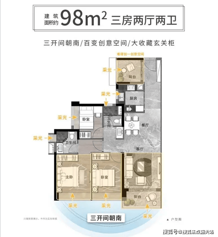 建面约 98㎡三房两卫:总价约 370 万起,首付约 111 万起,主城三房门槛,刚需轻松上车。