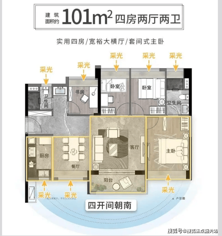 建面约 117㎡四房两卫:总价约 450 万起,首付约 135 万起,改善四房优选,空间尺度舒适。