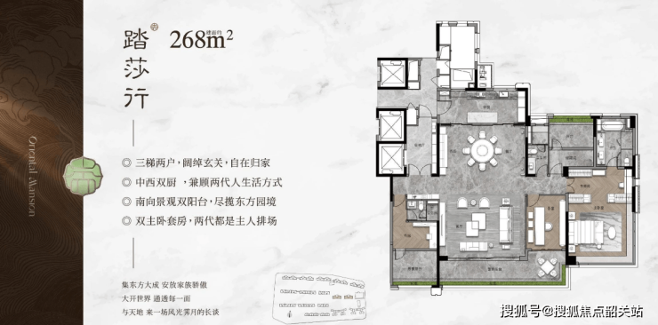 107-268㎡户型:涵盖从三房到五房的不同面积段,满足不同家庭的需求。特别是143平米户型,实现了专梯入户的设计,提升了居住体验;而268平米户型则采用了3梯2户的私密布局,设有保姆电梯和独立衣帽间,充分考虑了高端住户的生活习惯。