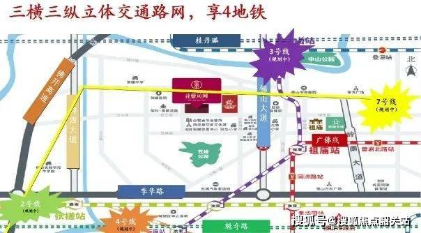三横为桂丹路、季华路、魁奇路;三纵为佛开高速、禅西大道、佛山大道;规划中的四地铁为 1 号线、2 号线、4 号线、7 号线。