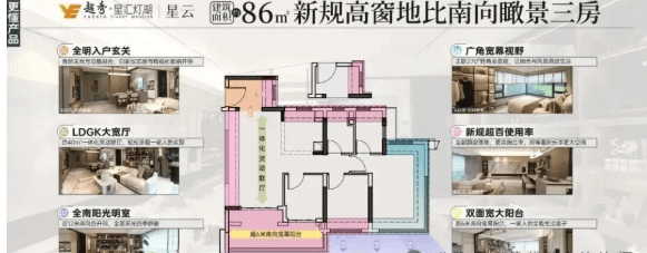 项目主力户型为建面约86㎡三房与106㎡四房,全面执行佛山新规设计,实现超百使用率,在同面积段中多得一房,极大提升空间实用性。全系户型南北通透、户户朝阳,确保阳光与景观资源公平共享。其中,约86㎡“云舒”户型以三房两卫格局打破小户型局限;约106㎡“星宸”四房则通过LDGK(客厅、餐厅、厨房、阳台)一体化设计,打造超宽开间,强化家庭互动场景。建材标准对标顶豪级别,全屋配备中央空调、新风系统及轻智能厨电,飘窗采用全幅落地设计,最大化引入自然光线与景观视野,细节之处尽显对人居体验的深度洞察。
