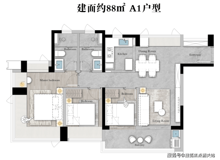 约88㎡艺术家户型:主卧独立套间,奢享私密生活;约5.4米超阔绰观景阳台,南北通透,双面采光格局明亮。