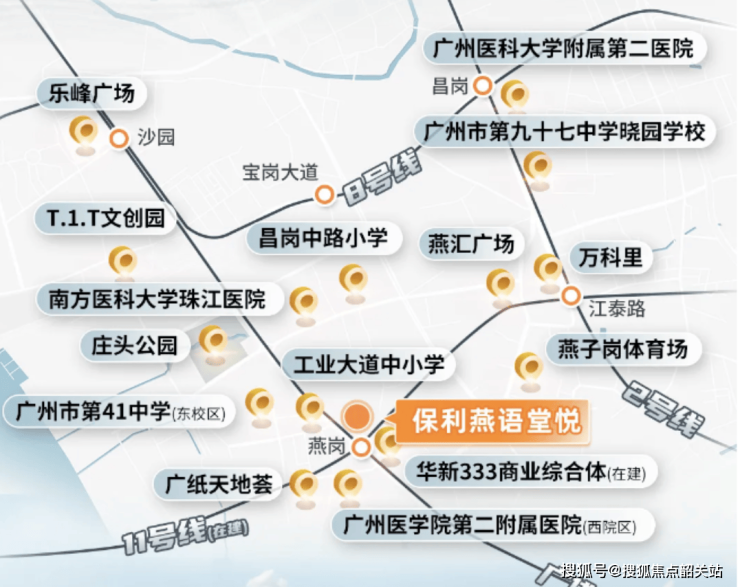 保利燕语堂悦坐落于广州城市发展主轴——海珠西部核心区域,地理位置极具战略意义。项目位于工业大道中段,紧邻地铁广佛线与11号线交汇站燕岗站,步行即可抵达,快速连接珠江新城、金融城、琶洲等多个核心区。周边汇聚南方医科大学珠江医院、广州市红十字会医院等多家三甲医疗机构,医疗资源丰富。商业配套齐全,南泰百货、燕汇广场、万科里等成熟商圈环绕,生活便利度极高。综合来看,无论是当前的生活舒适性,还是未来的升值潜力,这里都占据着不可替代的战略高地。