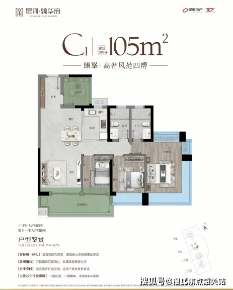 125㎡四房:分布在9号楼,迎宾入户花园设计,宽幕景观阳台和270°瞰景飘窗主卧,进一步提升了居住品质。