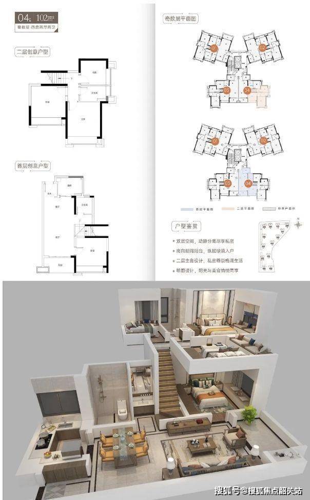 同样具备复式结构的优势,一层生活一层居住,动静分区明确。南北通透的设计让室内通风采光俱佳,全明户型让每个角落都充满阳光。102㎡的空间相较于 99㎡户型更加宽敞,在房间布局与功能设置上更加从容。多出来的空间可以优化卧室尺寸,或者增加更多的收纳区域,提升居住的实用性与舒适度。全屋国际一线品牌精装,以及各种贴心的功能设施,为业主打造精致生活。