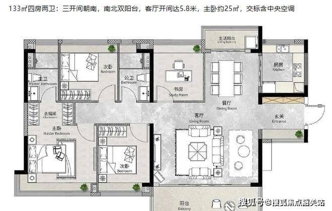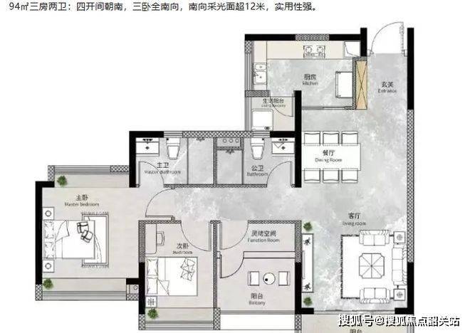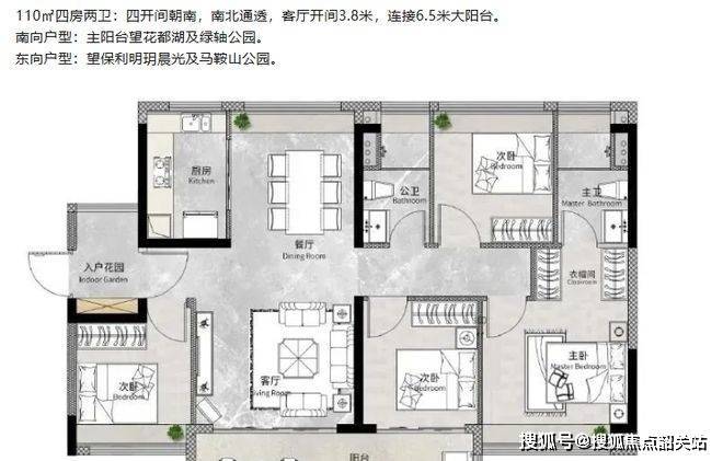户型设计很合理。94㎡三房两卫,四开间朝南,三卧全南向,南向采光面超 12 米,实用性强。110㎡四房两卫,四开间朝南,南北通透,客厅开间 3.8 米,连接 6.5 米大阳台,不管是南向望花都湖及绿轴公园,还是东向望保利明玥晨光及马鞍山公园,景观都很棒。133㎡四房两卫,三开间朝南,南北双阳台,客厅开间达 5.8 米,主卧约 25㎡,还交标含中央空调。而且 94㎡户型竖厅实用,110㎡和 133㎡户型十字厅对流,空间利用率可达 90% 以上。