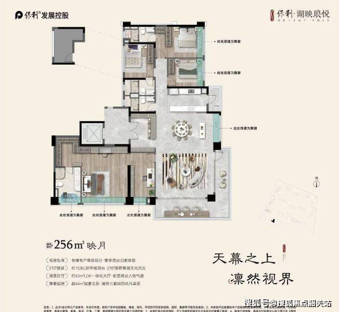 《映月》建面约 256㎡,专梯专户的设计,私密感更强,为业主打造专属的私密天地。270° 奢阔采光阳台,使室内拥有充足的采光,同时提供了无与伦比的观景视野。无论是白天欣赏湖光山色,还是夜晚仰望星空明月,都能在家中轻松实现。