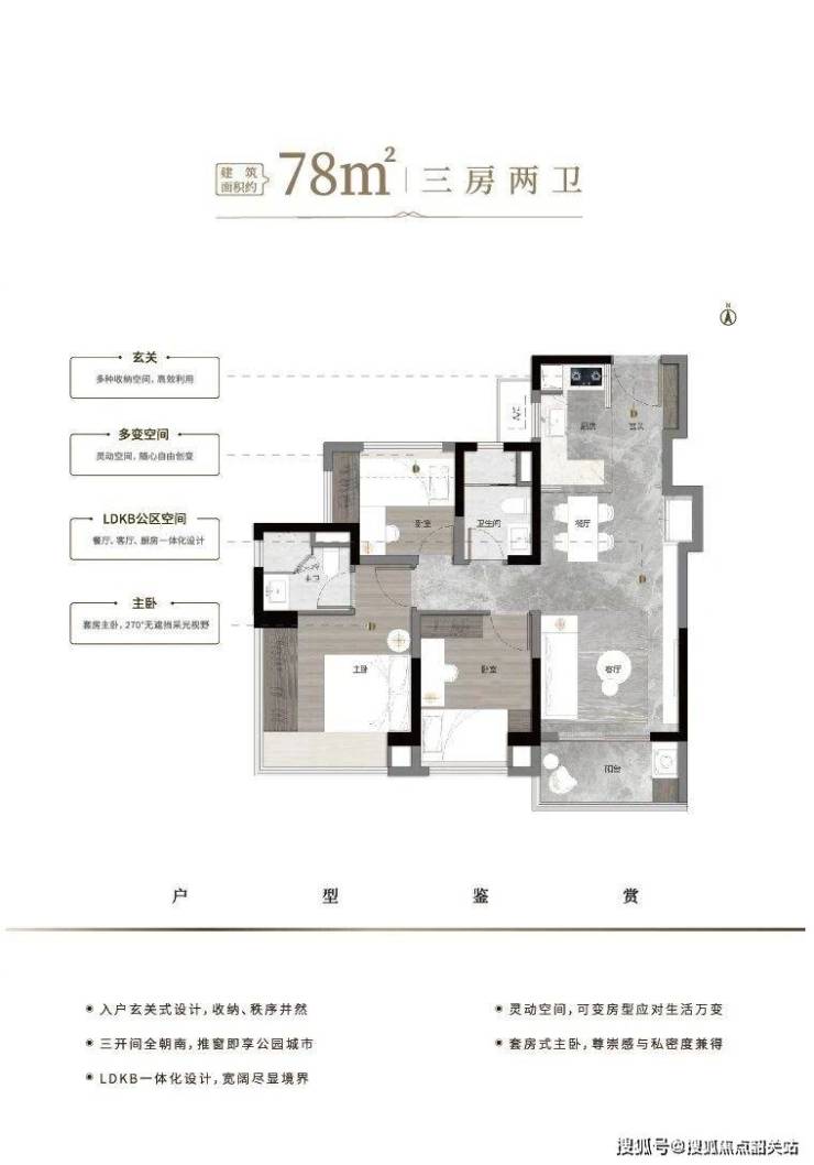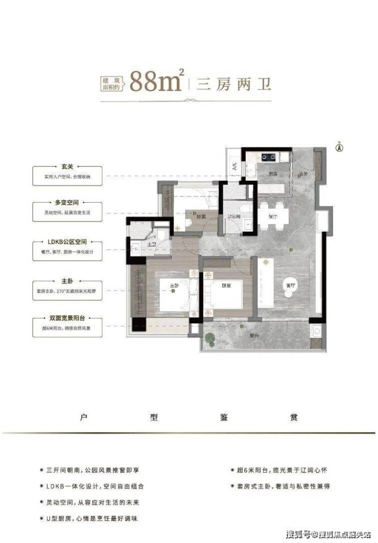 该户型空间布局合理,兼顾实用性与舒适度,超100%使用率让空间价值最大化,全南向设计与长阳台景观优势,能够满足三口之家的日常居住需求,同时具备一定的拓展性。