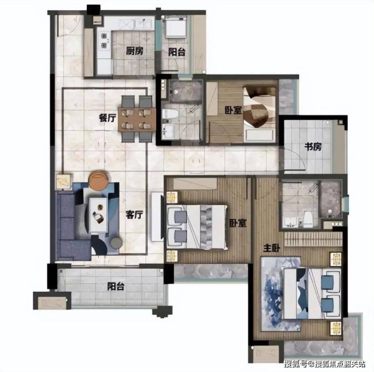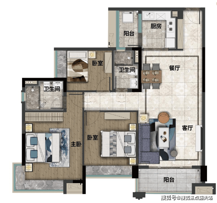 户型亮点:83-123㎡二至四房全系南向设计,南北通透,实用率高达 85%: