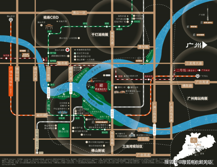 “五纵三横”成熟交通路网(五纵:佛山一环、广珠西线、南海大道、岭南大道、汾江路;三横:广明高速、佛陈路、魁奇路);毗邻佛山地铁2号线(在建)和6号线(规划中)交汇枢纽(花卉世界站),一站式连接广佛线、广佛环线城轨、广佛珠城轨,多维交通瞬达湾区。