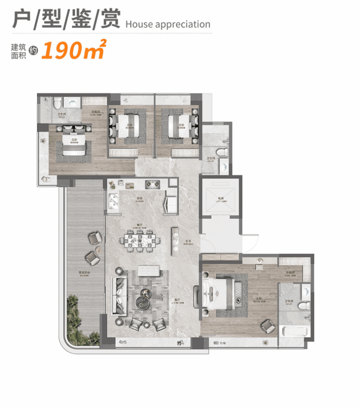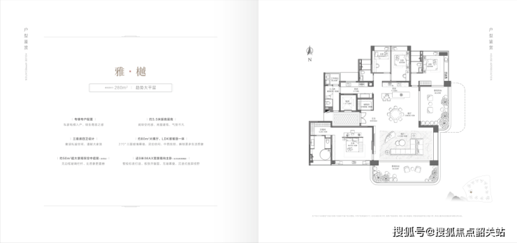 大平层产品,最大户型约280㎡,拥有超50㎡双空中观景庭院、超80㎡横厅。