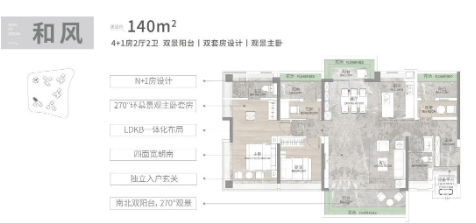 建面约140㎡户型:主卧三面采光,观景角度达到270°。