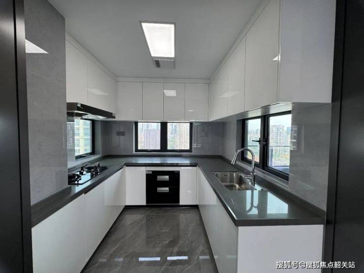 厨房空间配置三面采光窗,交付标准包含地柜、吊柜及全套品牌厨电。