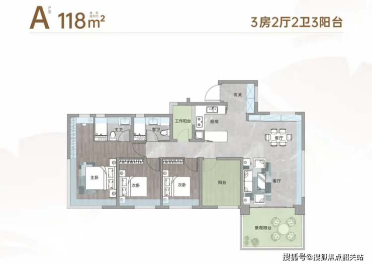 118平方米四房户型拥有约270度采光面,客餐厅连接12平方米大露台。