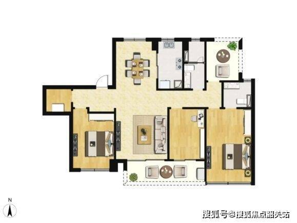 这款户型堪称经典,虽面积不大,但功能齐全,十分适合刚需购房者。传统布局让空间利用更加合理,动静分区明确,保障了居住的舒适性与私密性。2 + 1 房的设计灵活性高,多出的一房可根据家庭需求改造成书房、儿童房或衣帽间等,满足不同生活场景。两卫配置方便家庭成员使用,避免早晚高峰的拥挤。客厅与餐厅相连,空间开阔,连接阳台,采光通风俱佳,为家庭活动提供充足空间。整体而言,该户型以其高性价比和实用性,为年轻家庭或单身人士提供了温馨舒适的居住空间。