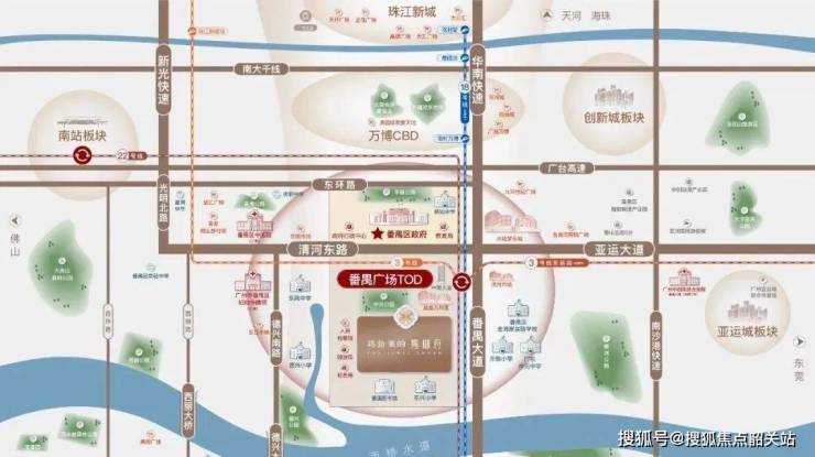 广州惟一双高速地铁区域。项目距离地铁番禺广场站约 900 米距离,囊括3号线、3号线东延段(在建中),已开通的广州地铁 3 号线、18 号线、22 号线,未来规划有广州地铁 17 号线,5 轨汇聚于此,如此便捷的交通路网是其他板块难以比拟。
