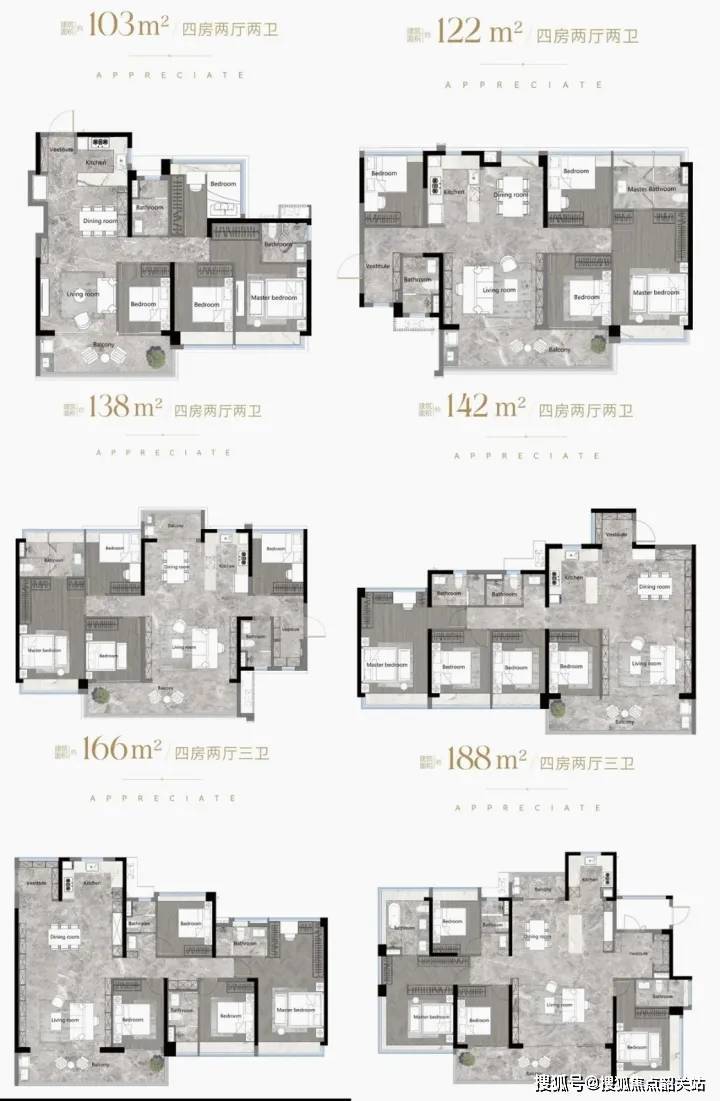越秀万博城首开组团提供多种户型选择,涵盖103-188平方米的三到四房设计。户型设计注重实用性与舒适性,如103平方米的3+1房户型,拥有超6米宽的大阳台和超过22米的南向采光面;110平方米的3+1房,四开间朝南;139平方米的4+1房,拥有近3平方米的独立入户花园。所有户型均采用LDKB设计,确保四开间朝南、双开间大阳台,并通过飘窗和花池设计增加使用空间。