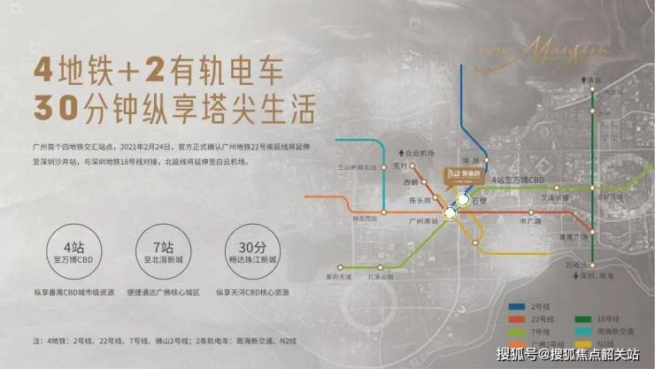 4地铁:2号线、22号线、7号线、佛山2号线。4站至万博CBD、7站至北滘新城、30分钟至珠江新城。