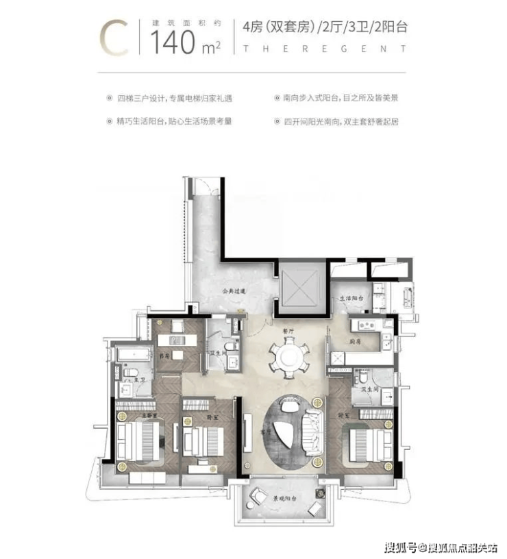 大平层:面积从140㎡到480㎡不等,每个户型都强调空间利用效率和舒适度,部分户型拥有270度全景视野。