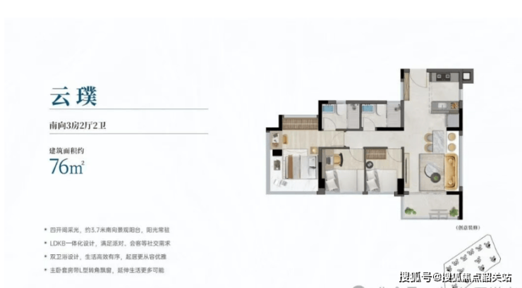 76㎡三房两厅一卫:刚需爆款,全南向设计,三开间采光,格局方正、动静分区;客厅连接南向阳台,卧室带全景飘窗,小面积实现大空间,总价低、门槛低,适合刚需上车。