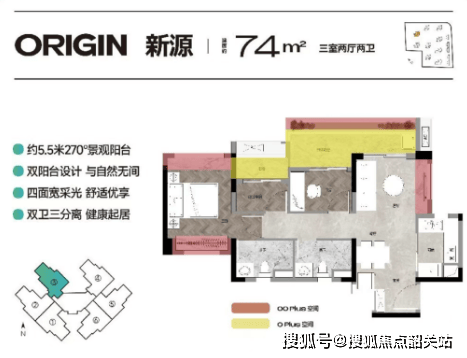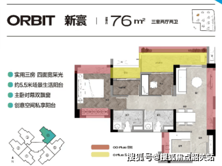 74方/76㎡三房两卫:小户型设计合理,四面宽采光,5.5米超大阳台,提供充足的自然光线。