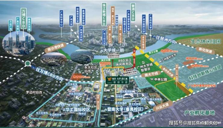 越秀·大学星汇城位于广州番禺新造板块,这里坐拥广州南拓的核心资源,是高新科技企业和未来创新人才的汇集地。东侧为大学城,南接琶洲国际会展区,西邻万博商圈,而北面则是连接市区的重要枢纽,交通便捷、商机无限。此外,大学城的浓厚教育氛围、琶洲的商务活力,赋予项目无可比拟的居住和发展潜力。