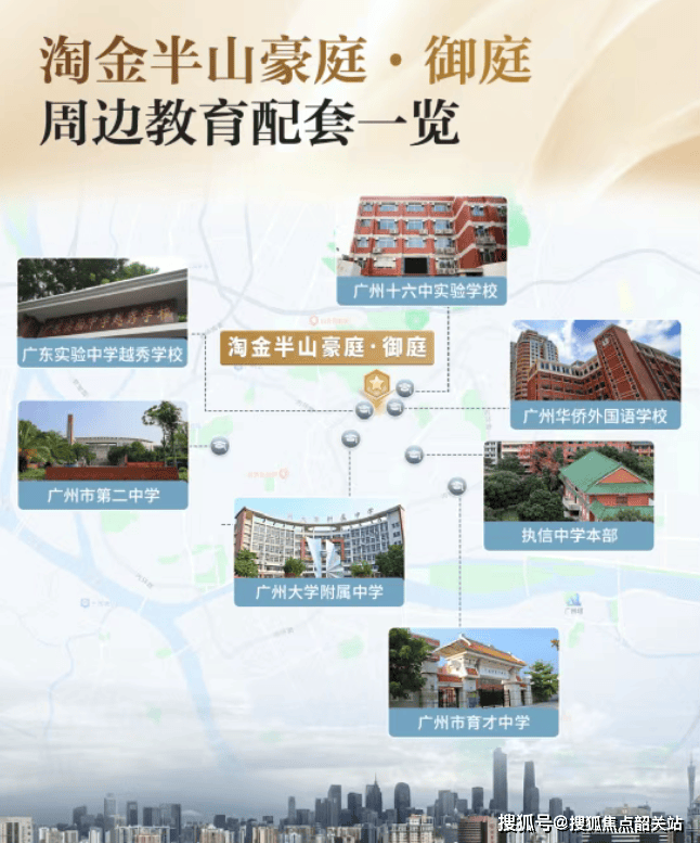 淘金半山豪庭·御庭自配建了广州首间公办九年一贯制外语特色学校——广州市华侨外国语学校,该校小升初比例高达约56%,连续14年中考成绩居于越秀区辖公办学校之首。周边还有执信中学、广州二中等多所重点中学环绕,形成了优越的小升初派位配置。