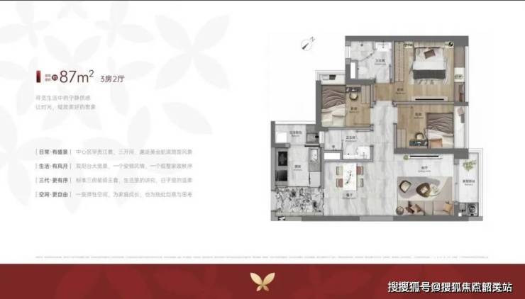 户型面积(㎡)特点总价(万元)3室2厅1卫76-78三开间望江,私密入户玄关273-2803室2厅2卫87-89主套设计,四开间朝南313-3204室2厅2卫107-143五开间朝南,全景落地窗385-500优惠政策: