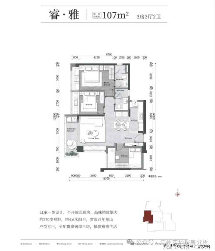 107㎡三房两厅两卫(西向):睿雅 107 平户型,850 万起,户型方正,厨卫全明,主卧套房设计,客餐厅相连,满足三口之家品质居住需求。