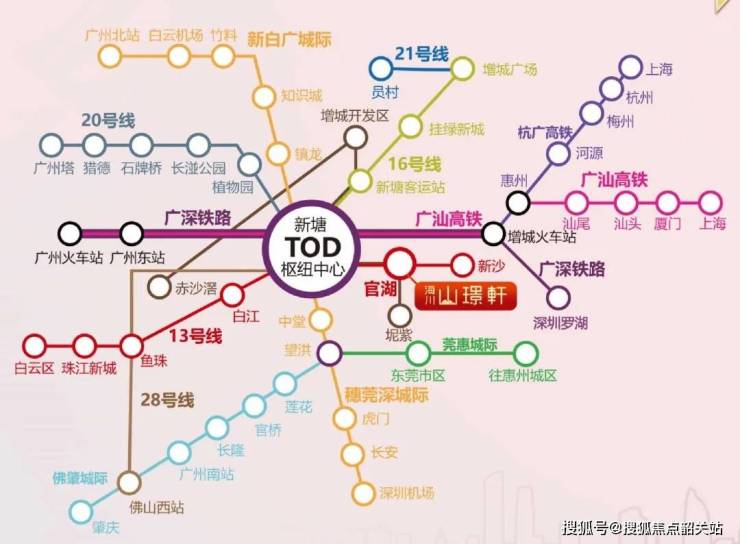与官湖站仅一站之隔即广州东部TOD新塘南站,九轨交汇(地铁 13/16/20/28 号线、穗莞深轻轨/新白广城际、广深/广汕/京九铁路),融入粤港澳大湾区一小时生活圈。
