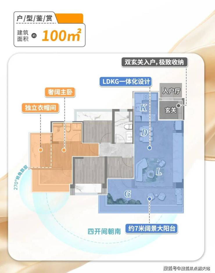 我重点看了89㎡和100㎡两个主力户型。89㎡做成了三房两卫,LDKG一体化布局让公共区显得很通透,4.8米横厅配上270°飘窗,采光不错;主卧28㎡还带独立卫浴。100㎡更少见——百平内做出正经四房,7.2米大阳台连通客厅和次卧,主卧有转角窗,视野开阔。两个户型得房率都超110%,在当下市场里确实算能打。